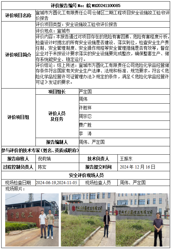 宣城市方圓化工有限責(zé)任公司倉儲(chǔ)區(qū)二期工程項(xiàng)目安全設(shè)施竣工驗(yàn)收評價(jià)報(bào)告