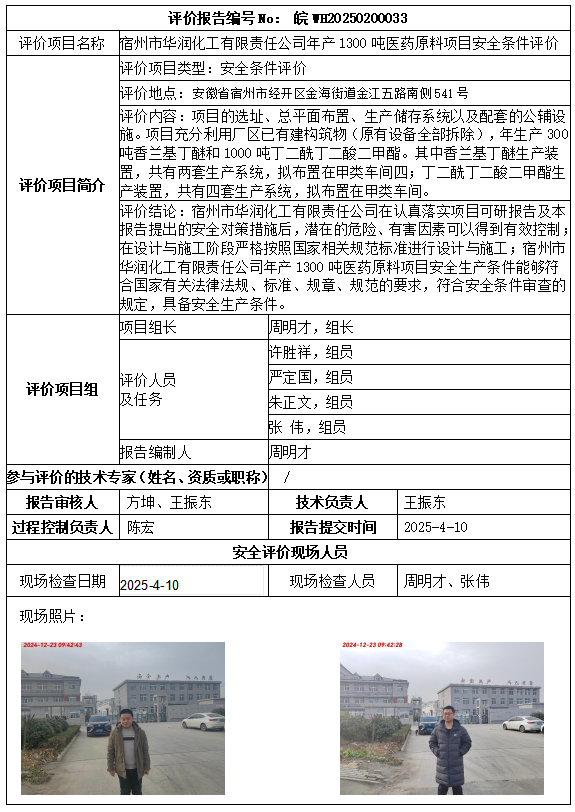 宿州市華潤化工有限責(zé)任公司年產(chǎn)1300噸醫(yī)藥原料項(xiàng)目安全條件評價(jià)