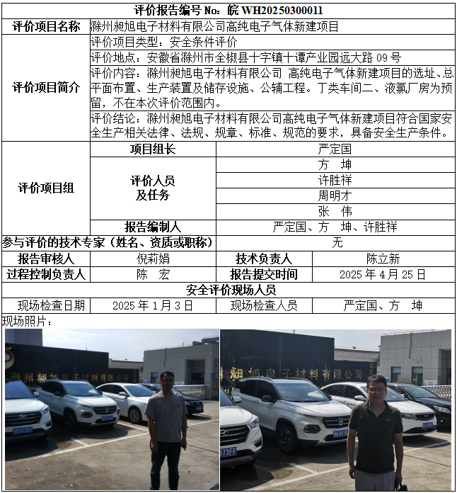 滁州昶旭電子材料有限公司高純電子氣體新建項(xiàng)目安全條件評價(jià)