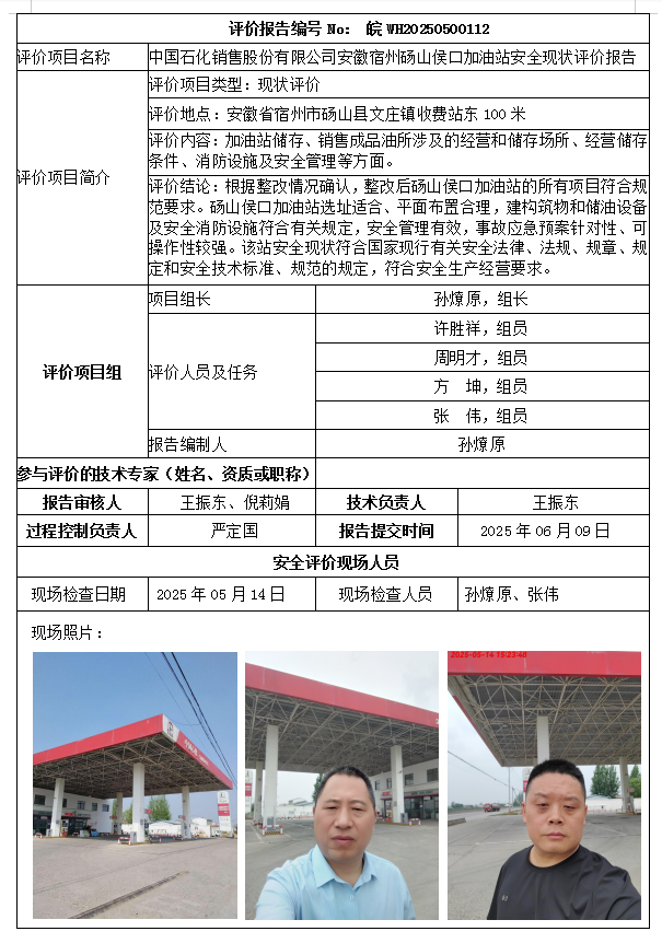 中國石化銷售股份有限公司安徽宿州碭山侯口加油站安全現(xiàn)狀評價報告