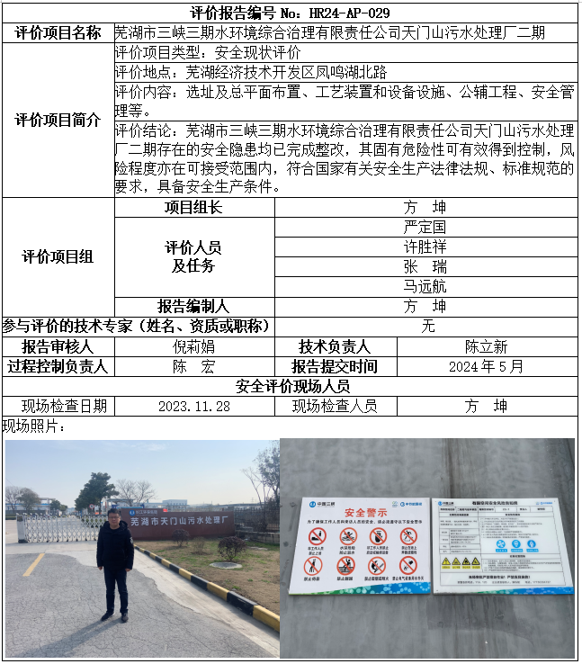 蕪湖市三峽三期水環(huán)境綜合治理有限責(zé)任公司天門(mén)山污水處理廠二期安全現(xiàn)狀評(píng)價(jià)