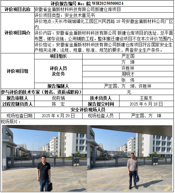 安徽省金盾新材料科技有限公司新建倉庫項(xiàng)目安全技術(shù)意見書