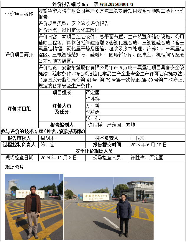 安徽華塑股份有限公司年產(chǎn)6萬噸三氯氫硅項目安全設施竣工驗收評價報告