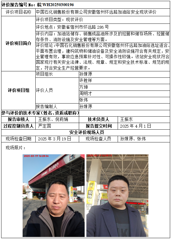 中國石化銷售股份有限公司安徽宿州懷遠(yuǎn)路加油站安全現(xiàn)狀評價(jià)