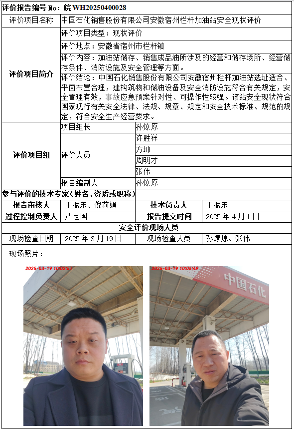 中國石化銷售股份有限公司安徽宿州欄桿加油站安全現(xiàn)狀評(píng)價(jià)