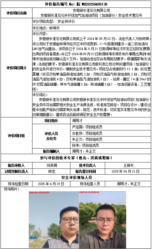 安徽新長淮石化有限公司 安徽新長淮石化中環(huán)線加氣加油站項(xiàng)目(加油部分)安全技術(shù)意見書