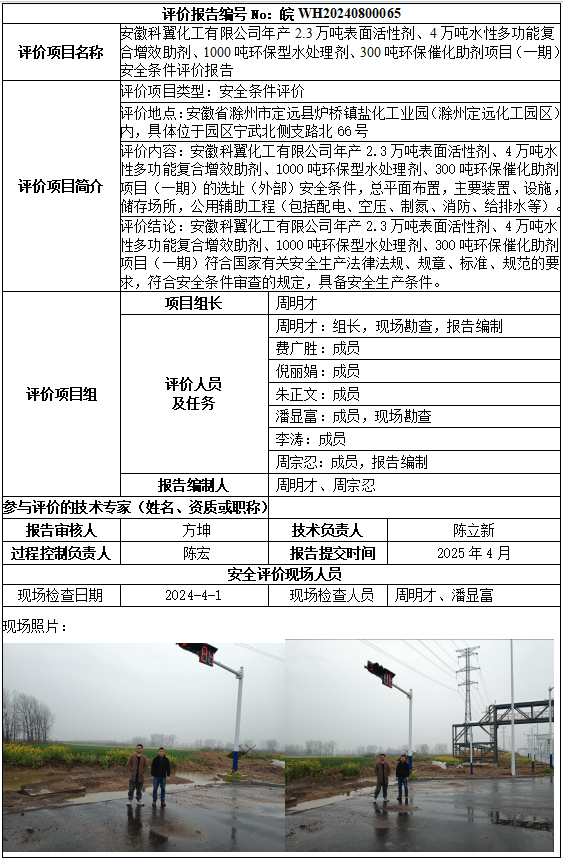 安徽科翼化工有限公司年產(chǎn)2.3萬噸表面活性劑、4萬噸水性多功能復(fù)合增效助劑、1000噸環(huán)保型水處理劑、300噸環(huán)保催化助劑項(xiàng)目(一期)安全條件評(píng)價(jià)報(bào)告