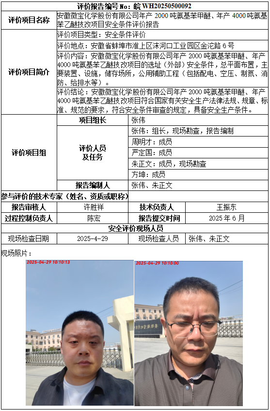 安徽微寶化學(xué)股份有限公司年產(chǎn)2000噸氨基苯甲醚、年產(chǎn)4000噸氨基苯乙醚技改項(xiàng)目安全條件評(píng)價(jià)報(bào)告