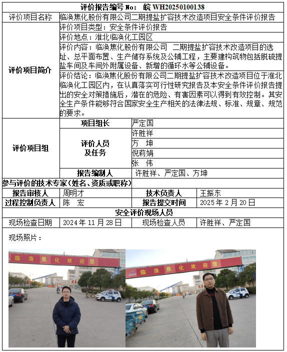臨渙焦化股份有限公司二期提鹽擴(kuò)容技術(shù)改造項(xiàng)目安全條件評(píng)價(jià)報(bào)告