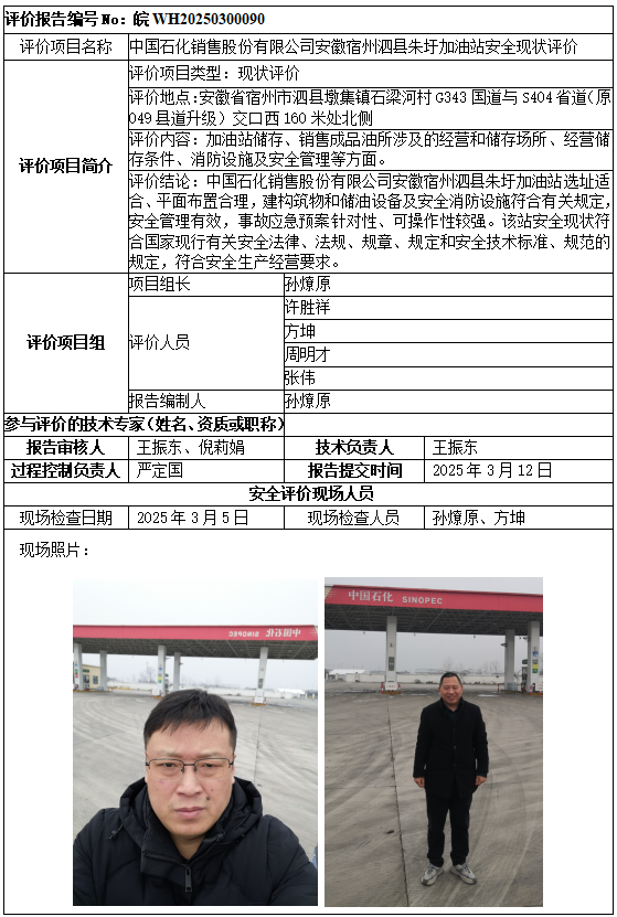 中國(guó)石化銷(xiāo)售股份有限公司安徽宿州泗縣朱圩加油站安全現(xiàn)狀評(píng)價(jià)