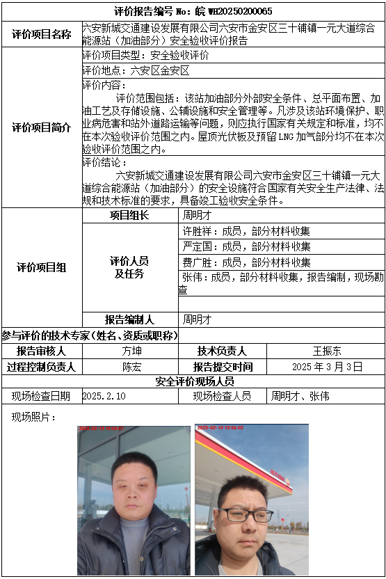六安新城交通建設發(fā)展有限公司六安市金安區(qū)三十鋪鎮(zhèn)一元大道綜合能源站(加油部分)安全驗收評價報告