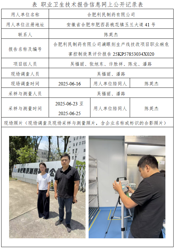 合肥利民制藥有限公司滴眼劑生產線技改項目職業(yè)病危害控制效果評價報告