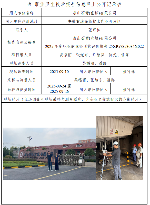 泰山石膏(宣城)有限公司 2025年度職業(yè)病危害現(xiàn)狀評價報告