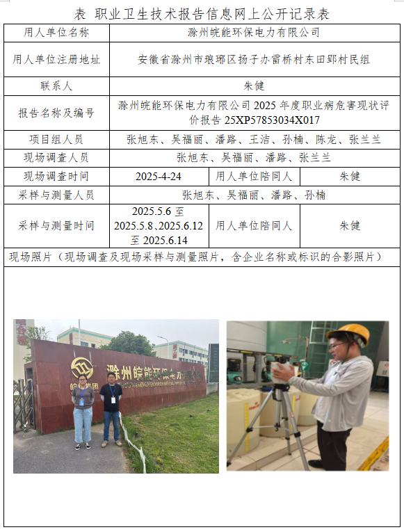 滁州皖能環(huán)保電力有限公司2025年度職業(yè)病危害現(xiàn)狀評價(jià)報(bào)告