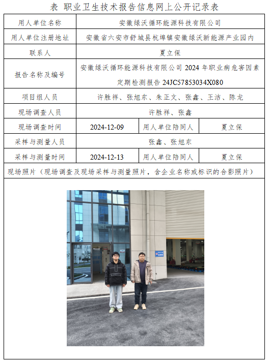 安徽綠沃循環(huán)能源科技有限公司2024年職業(yè)病危害因素定期檢測報告