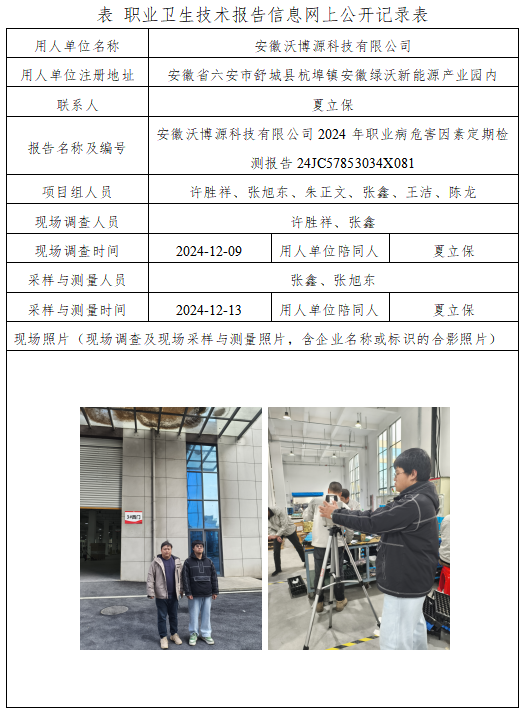 安徽沃博源科技有限公司2024年職業(yè)病危害因素定期檢測報(bào)告