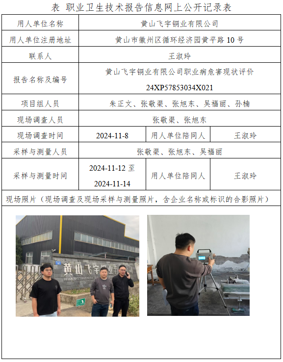黃山飛宇銅業(yè)有限公司職業(yè)病危害現狀評價