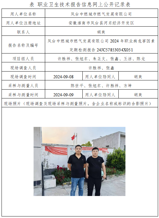 鳳臺中燃城市燃氣發(fā)展有限公司2024年職業(yè)病危害因素定期檢測報告