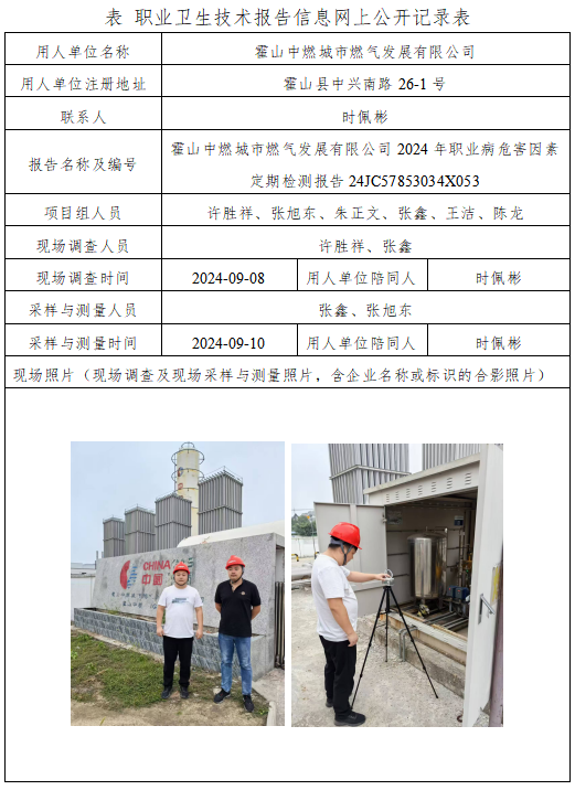 霍山中燃城市燃?xì)獍l(fā)展有限公司2024年職業(yè)病危害因素定期檢測(cè)報(bào)告