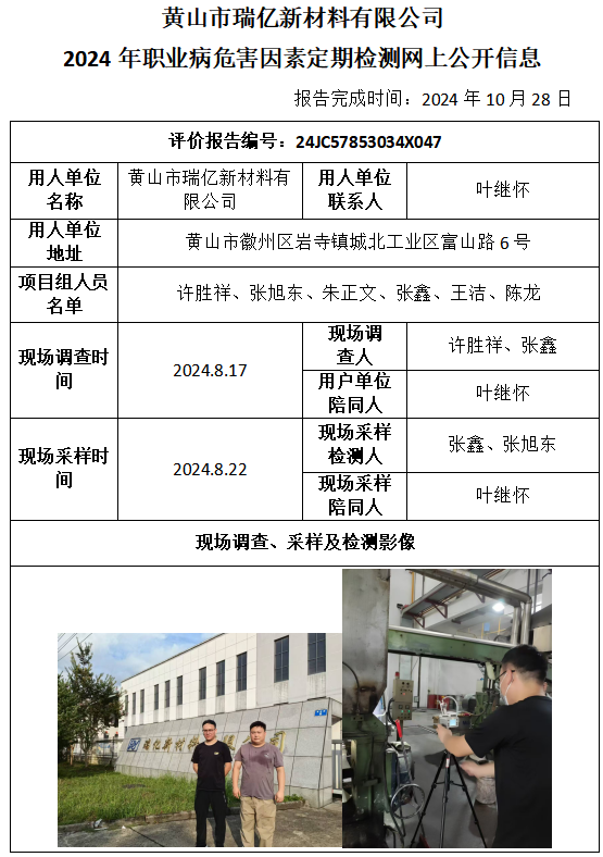 黃山市瑞億新材料有限公司 2024年職業(yè)病危害因素定期檢測網(wǎng)報告