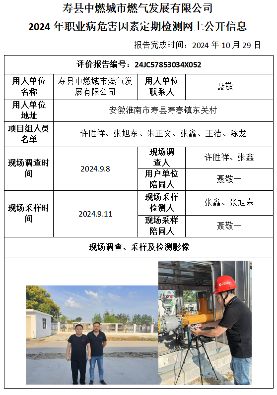 壽縣中燃城市燃氣發(fā)展有限公司 2024年職業(yè)病危害因素定期檢測報告